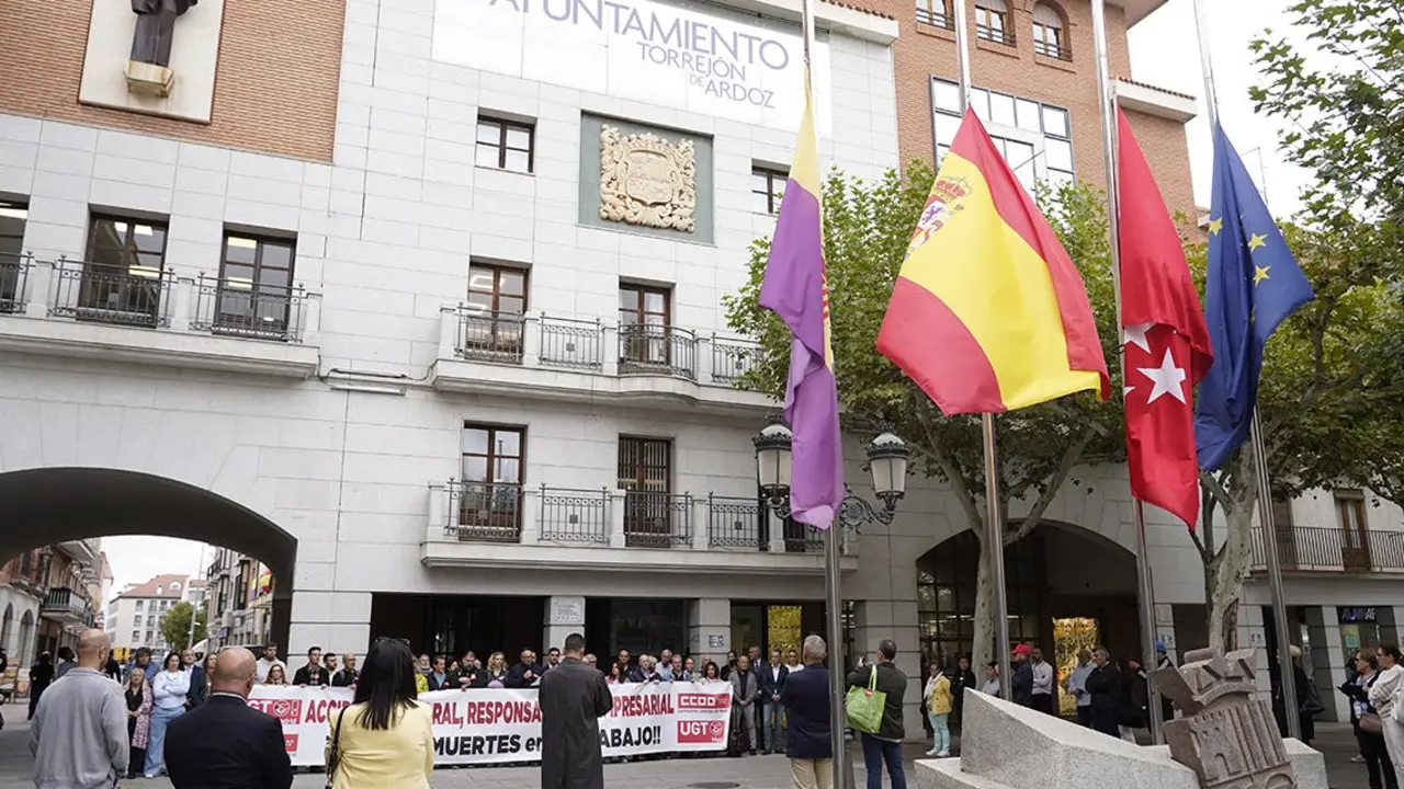 Concentraciones en Torrejón y Mejorada del Campo por los últimos accidentes laborales mortales Las banderas del Ayuntamiento de Torrejón ondean hoy a media asta. Redacción MiraCorredor 08/10/24