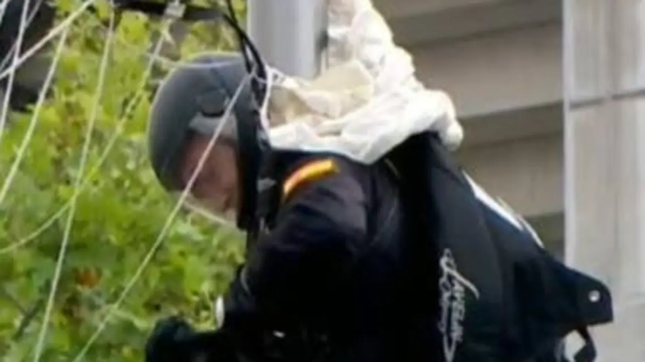 Un paracaidista de Paracuellos choca contra una farola en el desfile de la Fiesta Nacional Afortunadamente, el cabo, que acumula más de 600 saltos, no ha sufrido daños. Redacción MiraCorredor 12/10/19