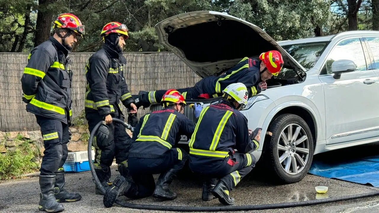 Aparatoso rescate de una gata atrapada en el motor de un coche en Boadilla Los Bomberos tuvieron que utilizar varias herramientas hasta conseguir liberar al animal. Redacción MiraCorredor 11/10/24