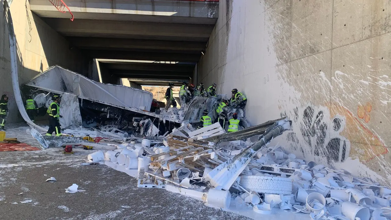 Un tráiler cargado de pintura cae desde la M-45 a la R-3 dejando dos heridos graves Los dos heridos son el conductor del camión y su acompañante. Redacción MiraCorredor 06/02/23