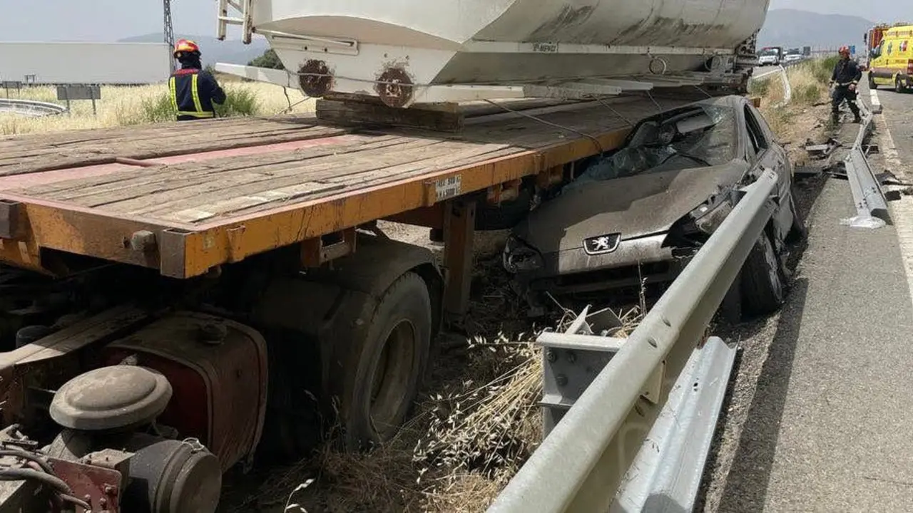 Tres heridos graves en un accidente entre dos coches y un camión en la A-1 Tras el choque, los dos turismos quedaron empotrados en el lateral y en la parte trasera del camión. Redacción MiraCorredor 15/06/22