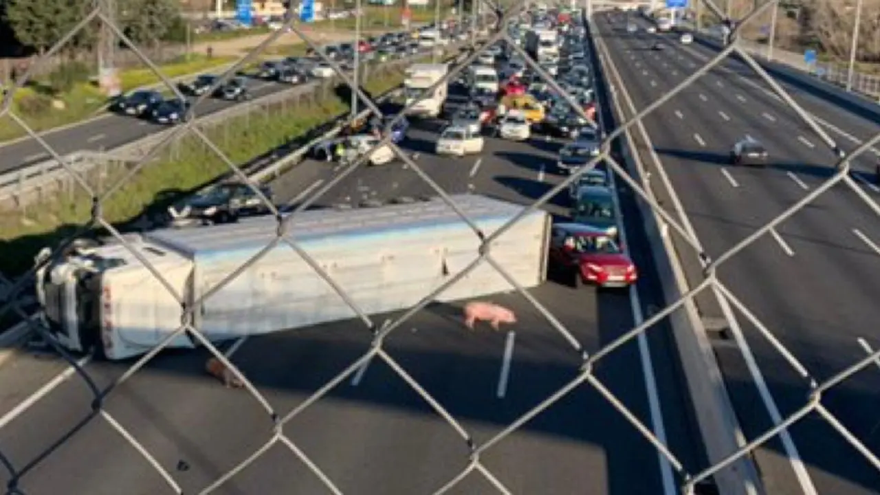 Vuelca un camión cargado de cerdos en la A-6 No ha habido heridos de gravedad pero se ha formado un gran atasco. Redacción MiraCorredor 24/02/20