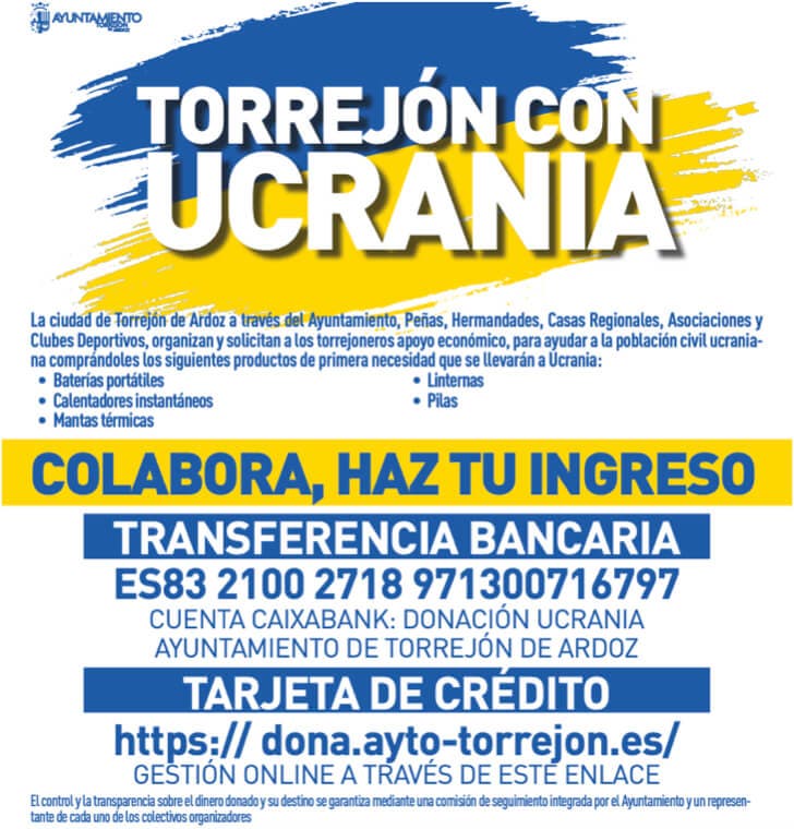 La ciudad de Torrejón de Ardoz a través del Ayuntamiento, peñas, hermandades, casas regionales, asociaciones y clubes seportivos, organizan y solicitan a los torrejoneros apoyo económico, para ayudar a la población civil ucraniana comprándoles los siguientes productos de primera necesidad que se enviarán a Ucrania: baterías portátiles, linternas, calentadores instantáneos, pilas y mantas térmicas.