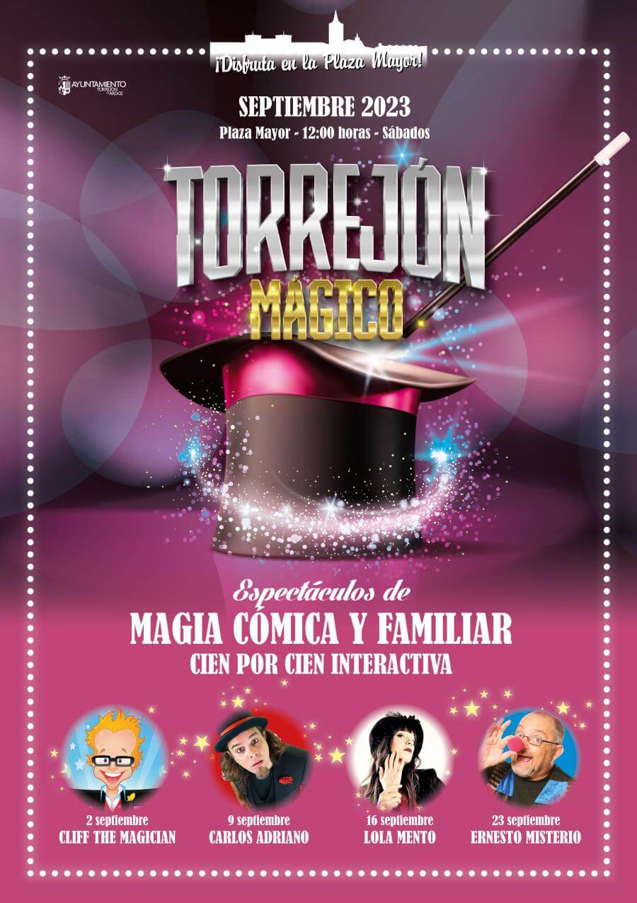 Torrejón Mágico se celebrará todos los sábados del mes de septiembre bajo la gran carpa de la Plaza Mayor protegido del sol y la lluvia. Así, el sábado 9 de septiembre será el turno de Carlos Adriano y el 16 de septiembre de Lola Mento. Por último, el 23 de septiembre la iniciativa finalizará con Ernesto Misterio.