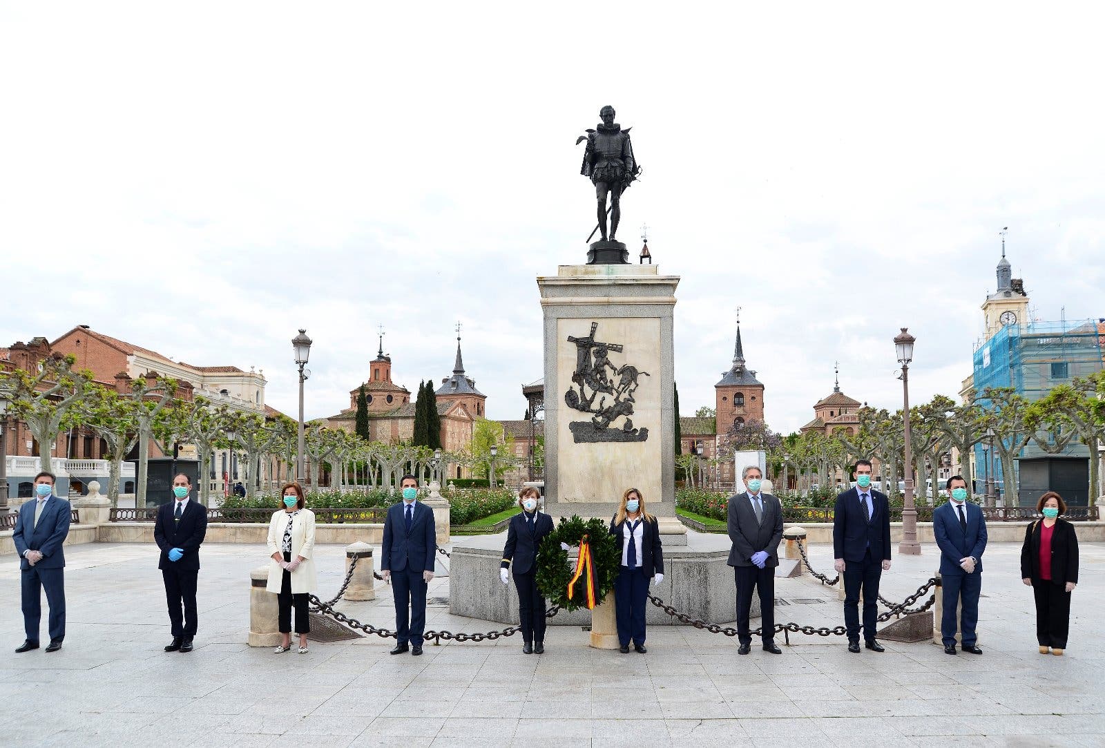 A pesar de que este 23 de abril es diferente a los anteriores, el alcalde, Javier Rodríguez Palacios, el rector de la Universidad y los portavoces de los grupos políticos del Ayuntamiento, todos con guantes y mascarillas, han mantenido la tradición depositando una corona de laureles a los pies de la estatua de Cervantes para conmemorar su muerte, y han guardado un minuto de silencio por los fallecidos por el coronavirus.