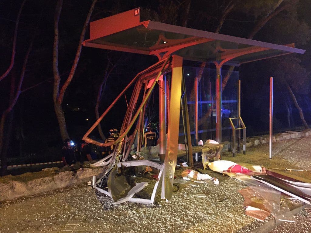 Los Bomberos del Ayuntamiento de Madrid han retirado el coche que ha quedado volcado en un terraplén de zona arbolada, mientras que la marquesina, como se puede ver en las fotos, ha quedado completamente destrozada.