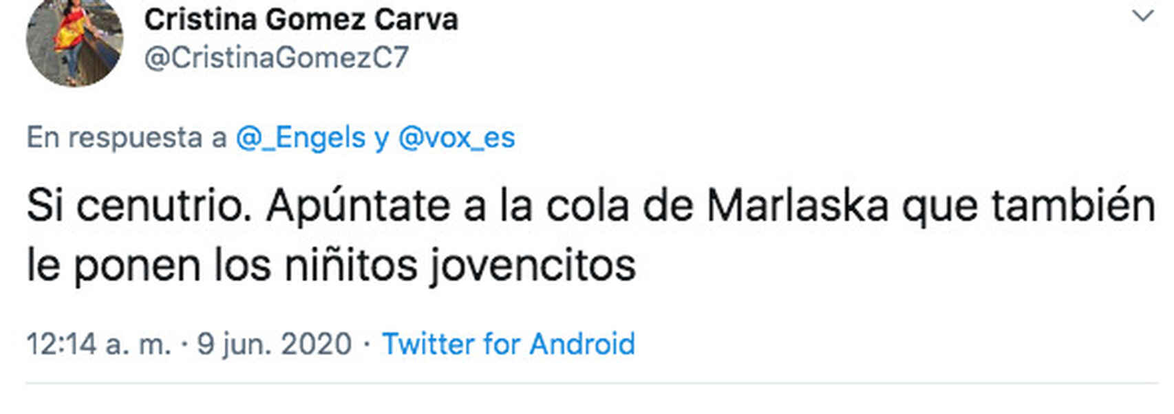 La formación de Santiago Abascal considera «inaceptables» comentarios como «a ti qué te va más, lamer coño o comer polla. Me han dicho que Marlaska anda como loco reclutando voluntarios», escribió la edil en la misma red social.