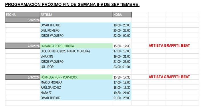 Este sábado, 7 de septiembre, se podrá disfrutar de las actuaciones de Toreros Muertos, con Pablo Carbonell interpretando canciones tan conocidas como Mi Agüita Amarilla. A continuación, será el turno de Seguridad Social, y sonarán éxitos como Chiquilla. Para finalizar, habrá una sesión especial con los DJs Jacobo Ostos y Benjamín Dorado.